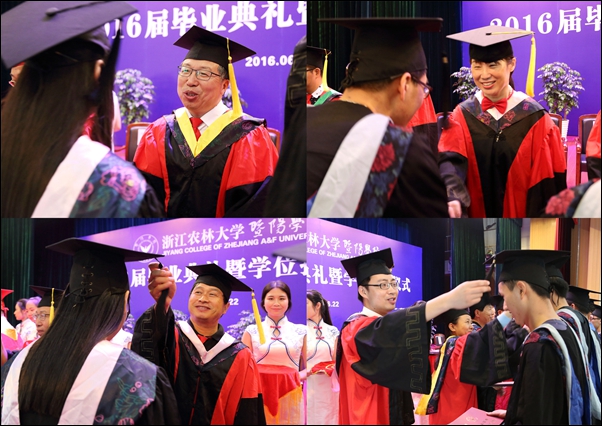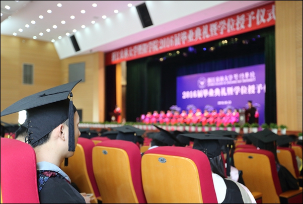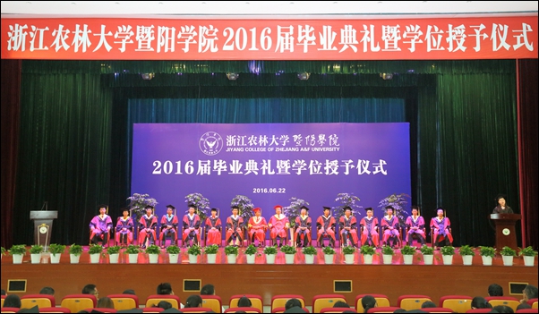 副院长修树东宣读了浙江省教育厅和2138acom太阳集团关于表彰2016届优秀毕业生的决定。主席台就座领导为学院优秀毕业生代表颁发荣誉证书,为毕业生代表颁发毕业证书和学位证书,扶正流苏。