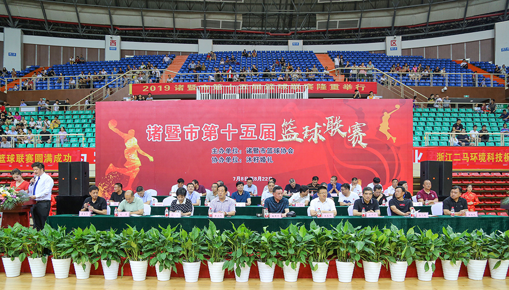 诸暨市人民政府副市长俞越致辞,诸暨市委副书记、市长王芬祥宣布2019年诸暨市第十五届篮球联赛开幕,浙江省篮球协会主席楼国华为比赛开球,我校老师李斌作为运动员代表宣誓。