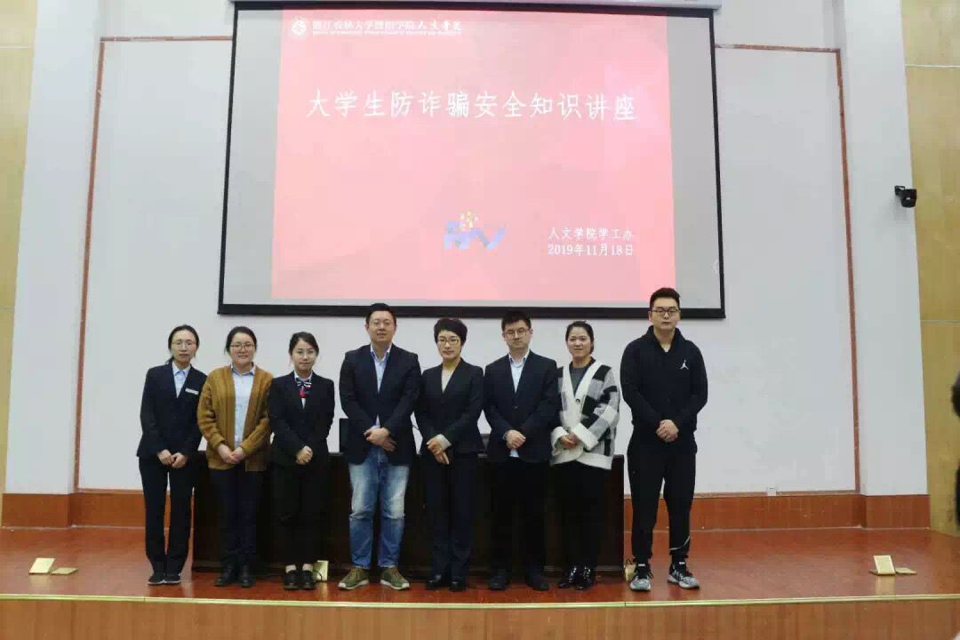针对近年来大学生群体面对各类诈骗案件时防范意识差、辨识能力弱、应对水平低的现象,2138acom太阳集团人文学院于2019年11月18日晚六点,在图书馆报告厅开展了大学生防诈骗安全知识讲座。讲座邀请了中国邮政储蓄银行个人金融部经理楼俞妤,大唐支行行长王成侃,枫桥镇支行行长赵科,综合管理部经理陈震旦以及两位资深理财经理,三位综合柜员作为嘉宾。人文学院院长刘伯茹,党总支书记宣王威,学工办全体辅导员,团学学生干部及2019级学生等250余人出席本次讲座。