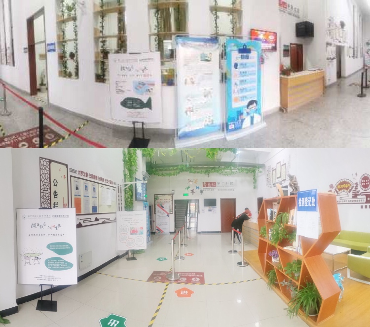下午的暨阳虽微雨绵绵,但宣传不停歇。展板宣传“转战”学生社区,在每个公寓一楼大厅继续布展,营造了很好的心理战疫氛围。