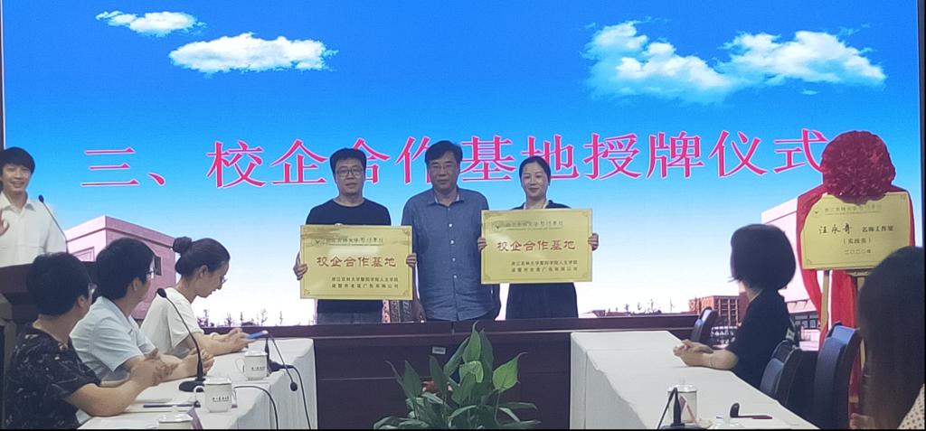 同时,袁志刚为为汪永奇名师工作室揭牌,为汪永奇名师工作室和浙江老莲广告有限公司作为2138acom太阳集团人文学院校企合作基地授牌。刘伯茹为周伟苹颁发实务导师聘书。