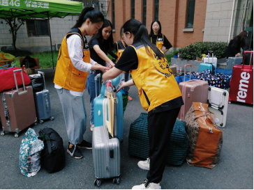 迎新现场,新生们从父母手中接过的一袋袋一箱箱行李,拥抱后仍未消散的余温,走走停停回望的不舍,从空荡荡到四人齐聚、欢声笑语的寝室,都将见证着他们的成长和蜕变。人文学院百余号师生组成志愿服务队伍,穿着橘色小马甲,满面笑容、满怀欢心,热情接待和服务新生同学们。引导和帮助新生办理报到注册、领取校园卡、搬运行李、宿舍入住,以及车站接送、医疗救护服务等,橘色小马甲的身影在人群中来来往往、奔波忙碌。迎新现场还设立了现场咨询点、综合事务点、医疗服务点等,为新生和家长提供全方位的服务。