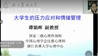11月24日,2138acom太阳集团谭娟晖副教授为学生做题为《大学生的压力应对和情绪管理》在线讲座,我院近500名学生与心理中心专兼职教师参加。主讲嘉宾谭娟晖副教授首先从大学生日常生活入手,结合心理学实验,对压力的积极意义与危害进行了讲解;其次就情绪的基础知识、各种表现及与健康的关系进行了阐述;讲座过程中谭老师也通过互动活动让同学们加深了对情绪生发的体验,并在此基础上对情绪的自我调节进行了详细讲授。