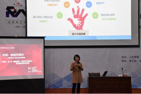 12月15日下午,人文学院在图书馆报告厅举办了出彩新青年论坛第十三讲《对话:致知与笃行--大数据在广告行业的应用》。此讲邀请了网联数科电视事业部总经理、中国杰出经理人徐珍女士作为主讲嘉宾。人文学院党总支书记宣王威,党总支副书记石杭科,文化传媒系主任李巧苗,文化传媒系教师代表,学工办教师代表以及广告学专业18级、专升本19级及20级各年级同学共230余人参加了本次活动。