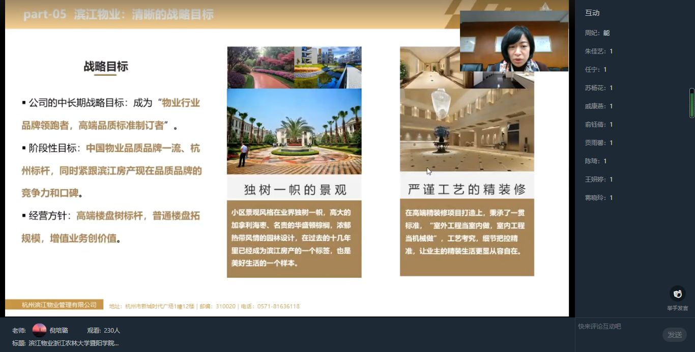 杭州滨江物业管理有限公司人力资源部总监任丽围绕公司简介、人才培养、薪资福利、招聘计划等四个方面对毕业生作招聘宣讲,并诚邀我院优秀毕业生加盟。宣讲结束后,数十名有兴趣的同学通过QQ群、微信群进一步了解公司发展与岗位招聘情况,并与杭州滨江物业管理有限公司建立了双向联系和沟通渠道。