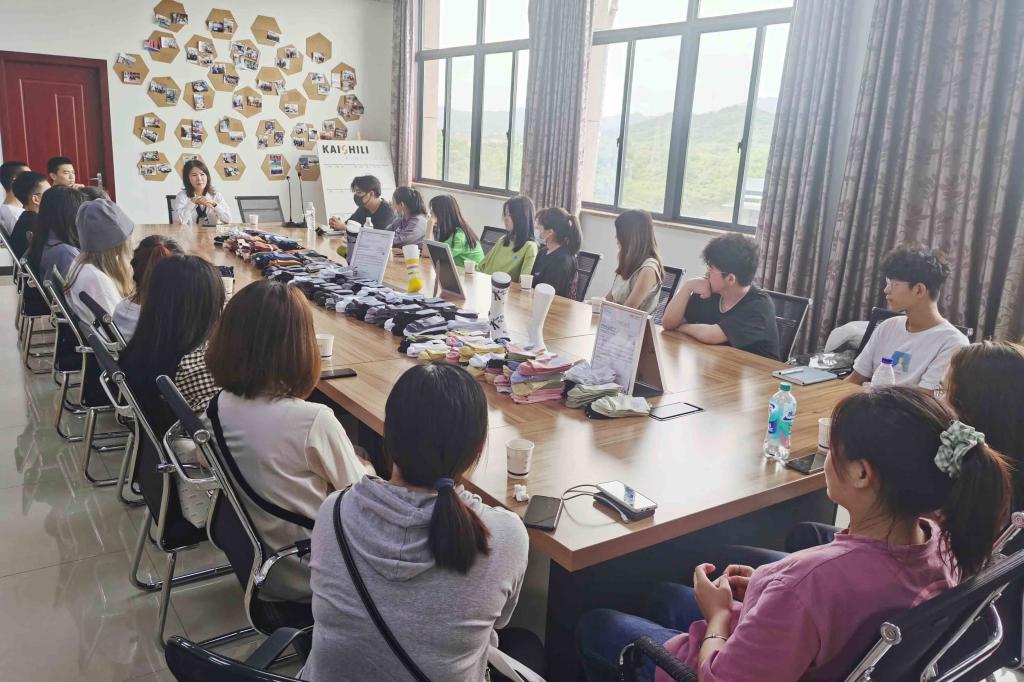 活动第二站来到浙江凯诗利科技有限公司。该公司主要是设计开发、生产销售原创潮袜。在公司负责人金建芳的现场介绍下,同学们参观了产品展示厅和智能化生产车间。参观后,在公司五楼会议室开展了“袜艺沙龙”圆桌活动。公司负责人详细分享公司的发展经历以及自己的创业心得,鼓励同学们敢想、敢闯,早定目标、早下决心,有了目标,有了决心就坚持不懈,一步一步向前挺进。同时,就如何更好地设计开发潮袜产品,与同学们进行了充分的交流互动。