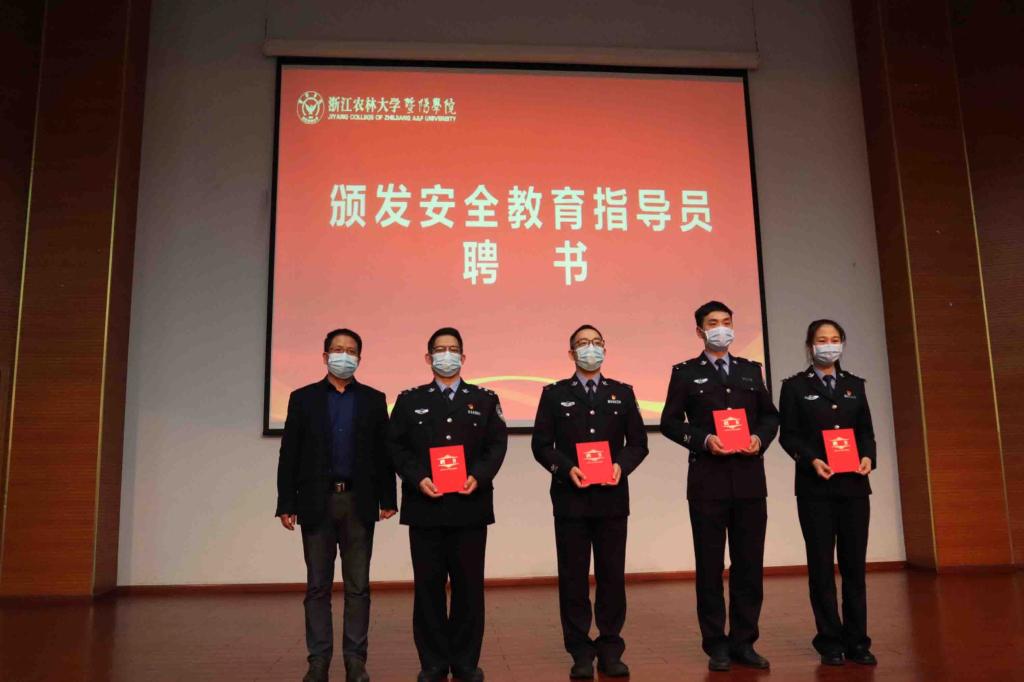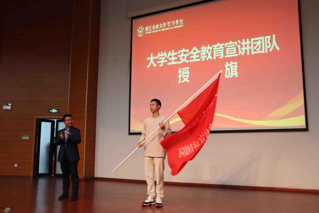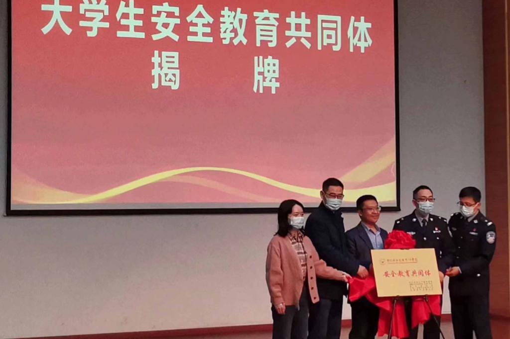 开幕式现场与会领导和嘉宾为学院大学生安全教育共同体揭牌,聘任了学院安全教育指导员,同时为大学生安全教育宣讲团队授旗。