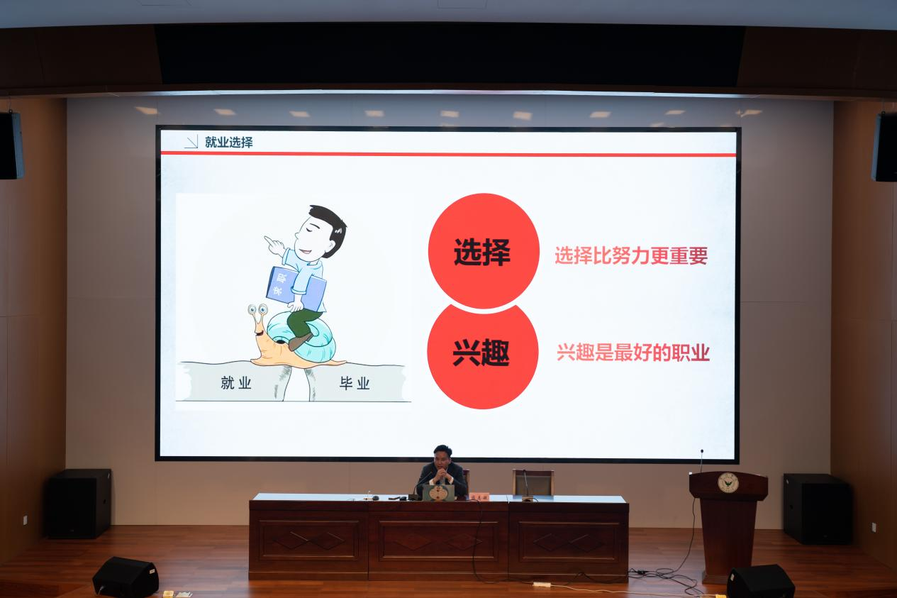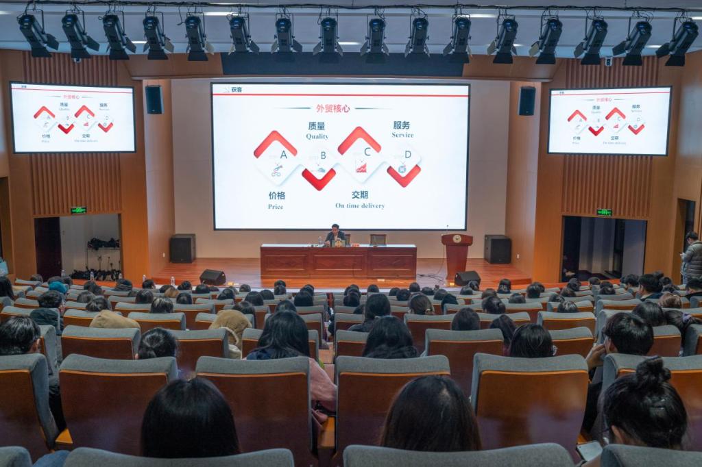 开场蒋董进行了简单的自我介绍,亿衡针纺作为诸暨袜业的领头羊,在外贸行业做得风生水起,光2020年就出口2亿1千万双袜子,荣登诸暨市出口企业排行榜第五位宝座。蒋董指出,同学们作为大三学生,一年后将面临毕业就业问题。这时,选择比努力更重要,兴趣是最好的职业!
