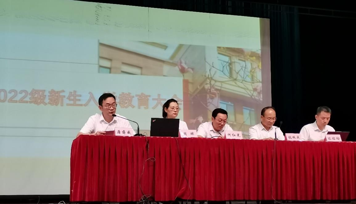 9月9日上午,商学院2022级新生入学教育大会在活动中心影剧院隆重举行。学院班子成员,各专业负责人、全体新生班主任和辅导员以及2022级全体新生参加大会。会议由学院党总支副书记屠蒋威主持。