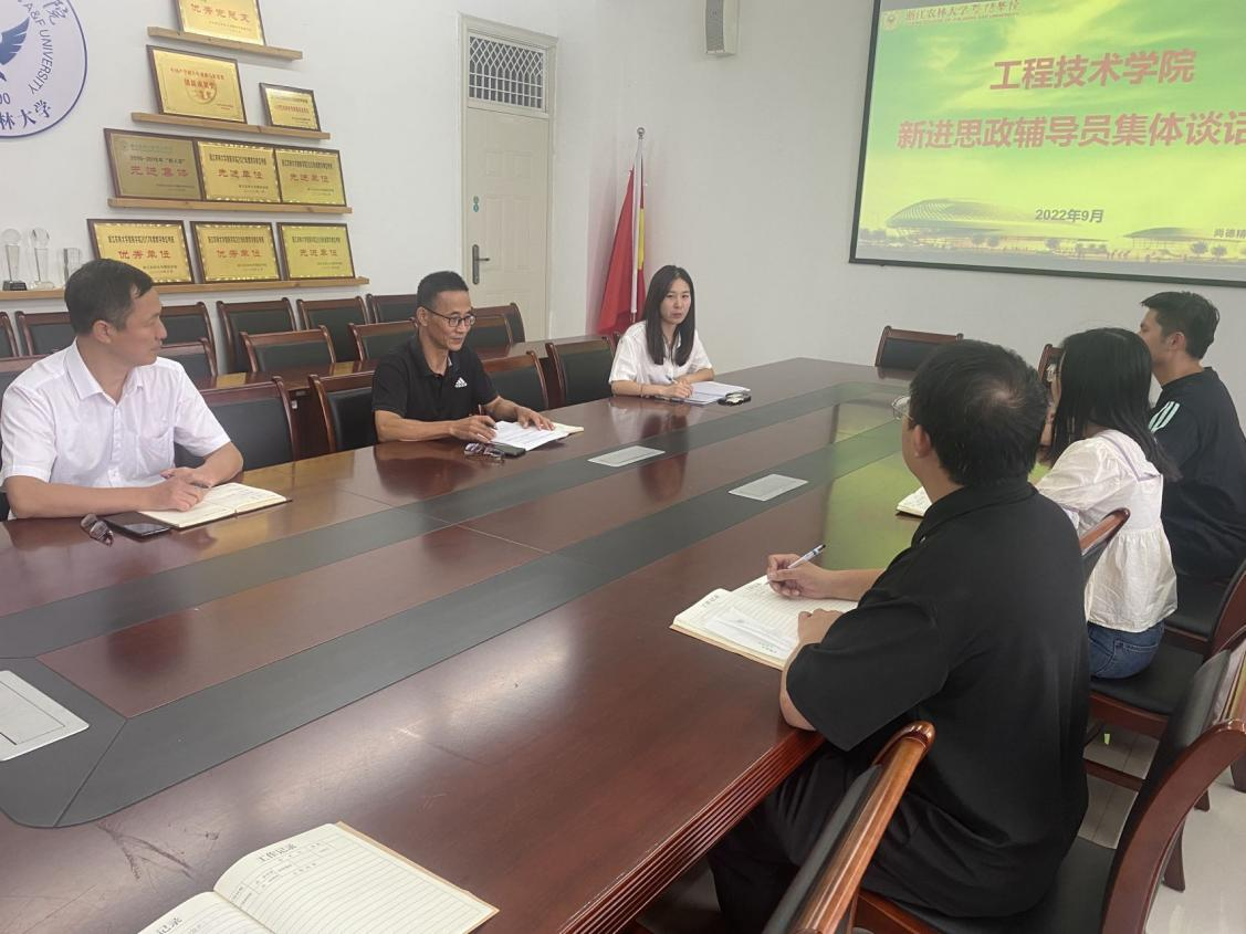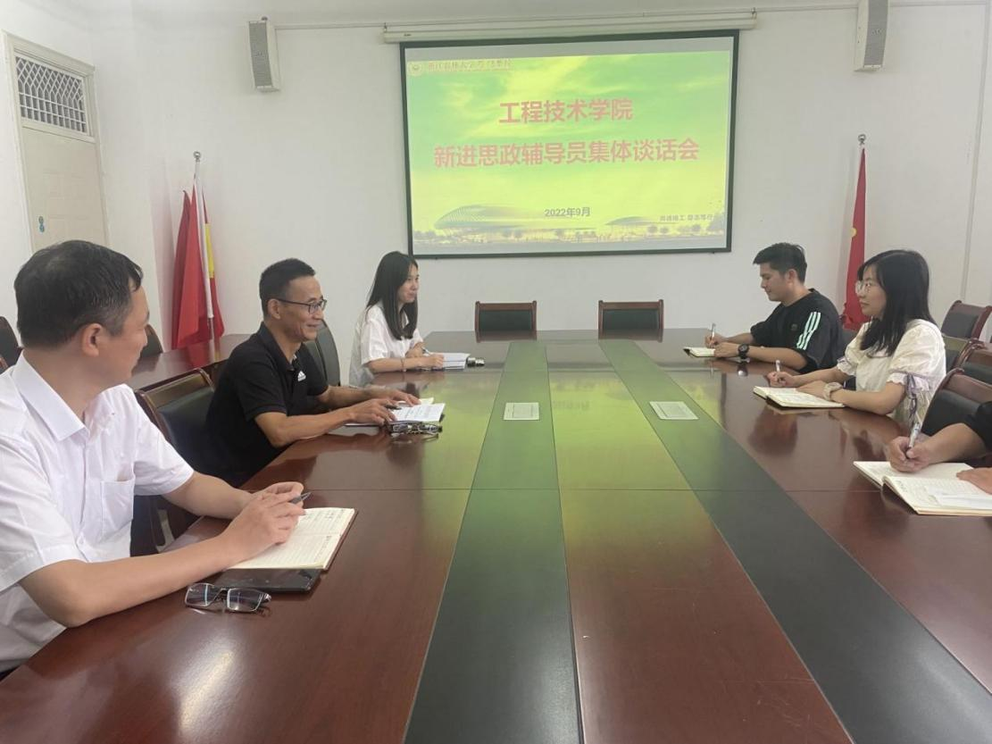 为帮助和引导新进辅导员树立正确的职业理想和育人理念,尽快适应辅导员工作岗位。9月20日下午,工程技术学院在理工3402会议室召开新进辅导员集体谈话会。工程技术学院院长彭樟林、党总支书记周聪、副院长胡建华、新入职的4位辅导员参加本次会议。