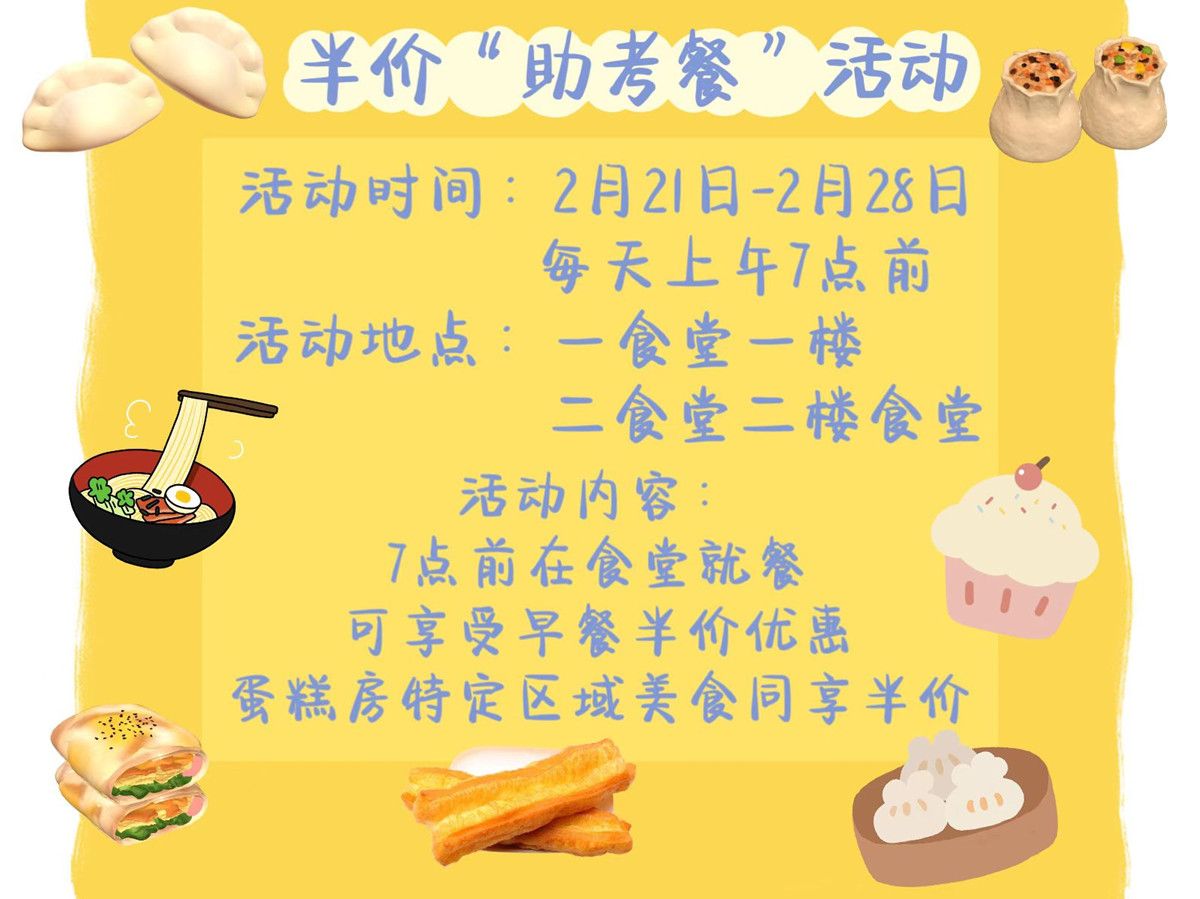 为助力2138acom太阳集团考试周,满足师生个性化、多元化饮食需求,积极践行后勤中心“我为师生办实事”活动要求,同时帮助师生及时调整好新学期工作学习状态,2月21日,诸暨服务部特别推出半价“助考餐”活动。