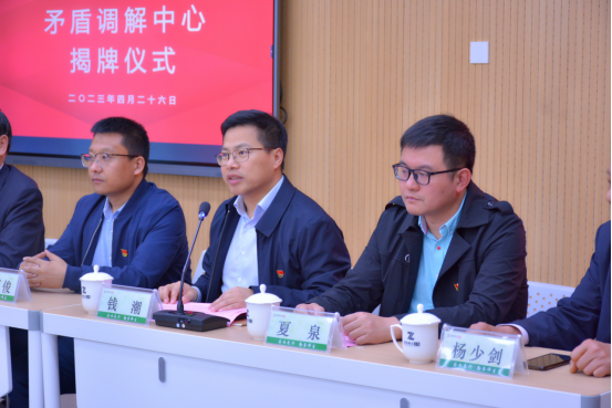 钱潮代表后勤中心党委对校园矛调中心的成立表示热烈的祝贺,向支持后勤工作的学院领导、有关部门及枫桥镇调解志愿者联合会表示衷心的感谢。他结合实际对矛盾调解中心今后的工作开展提出三点意见:一是扎实推进“枫桥经验”特色化实践;二是深入推进高水平平安校园建设;三是确保工作科学有序高效推进。他表示校园矛盾调解中心的成立,拓展了“枫桥经验”在高校的实践,深化了学院、后勤与诸暨的校地合作,开辟了新时代校园矛盾调解工作的新局面,是建设平安校园的一次新探索、新尝试,在学院、后勤中心和枫桥镇调解志愿者联合会的帮助下,矛盾调解中心一定能充分发挥纠纷调解工作质效,开创共建共治共享的社区治理新格局。