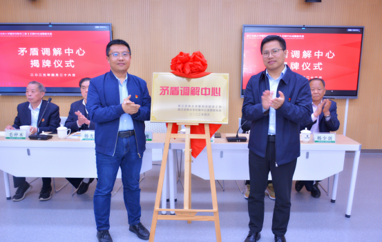 为创建平安和谐校园,提高发现、化解和处置校园内师生矛盾纠纷的能力,4月26日,学工部与诸暨服务部在诸暨市枫桥镇社会治理中心举行共建校园矛盾调解中心揭牌仪式。学院党委副书记高国俊,后勤服务中心党委副书记、纪委书记钱潮,枫桥镇调解志愿者联合会会长毛仲木出席仪式,仪式由吴越公司副总经理夏泉主持。会议邀请了枫桥镇调解志愿者联合会副会长杨光照作调解中心创建经验分享。