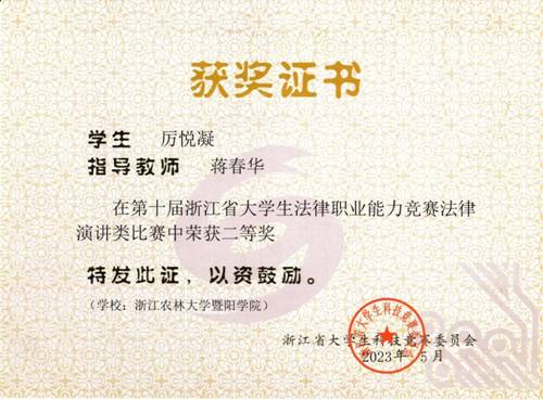 5月14日,在浙江省第十届大学生法律职业能力竞赛法律演讲类比赛中,人文学院、马克思主义学院法学专业学生斩获佳绩。周伯煌教授指导的单思琦同学获得二等奖,蒋春华老师指导的厉悦凝同学获得二等奖,宋晓丽老师指导的杨凯伊同学获得三等奖。