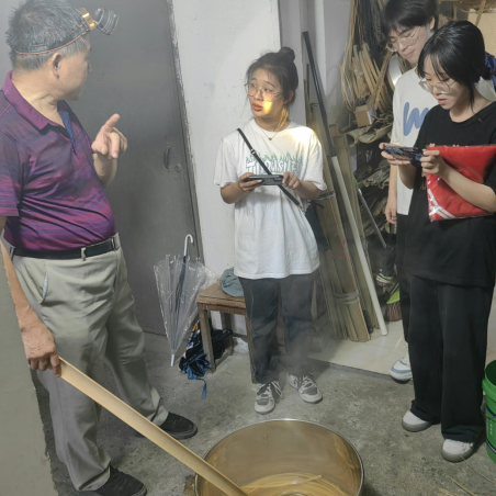 听师傅讲手艺,暗藏守护情感。到达袁建虎师傅的工作室后,正巧遇上袁师傅要进行竹编防腐防虫处理,他便借此机会为实践团成员们上了一堂关于竹编保久的课。课上,袁师傅悉心回答实践团成员们提出的疑惑之处,例如:倘若是用来防止食物的竹编制品,应该采用什么方法来进行防腐放虫处理等等。结束防腐防虫处理课后,袁师傅向实践团成员们讲解竹编这项指尖上的文化最关键的是一幅作品中的每一根篾片或篾丝的宽度。他表示,竹编工艺是他在手指尖沉淀的时光,更是承载着这他对美好生活的记忆!