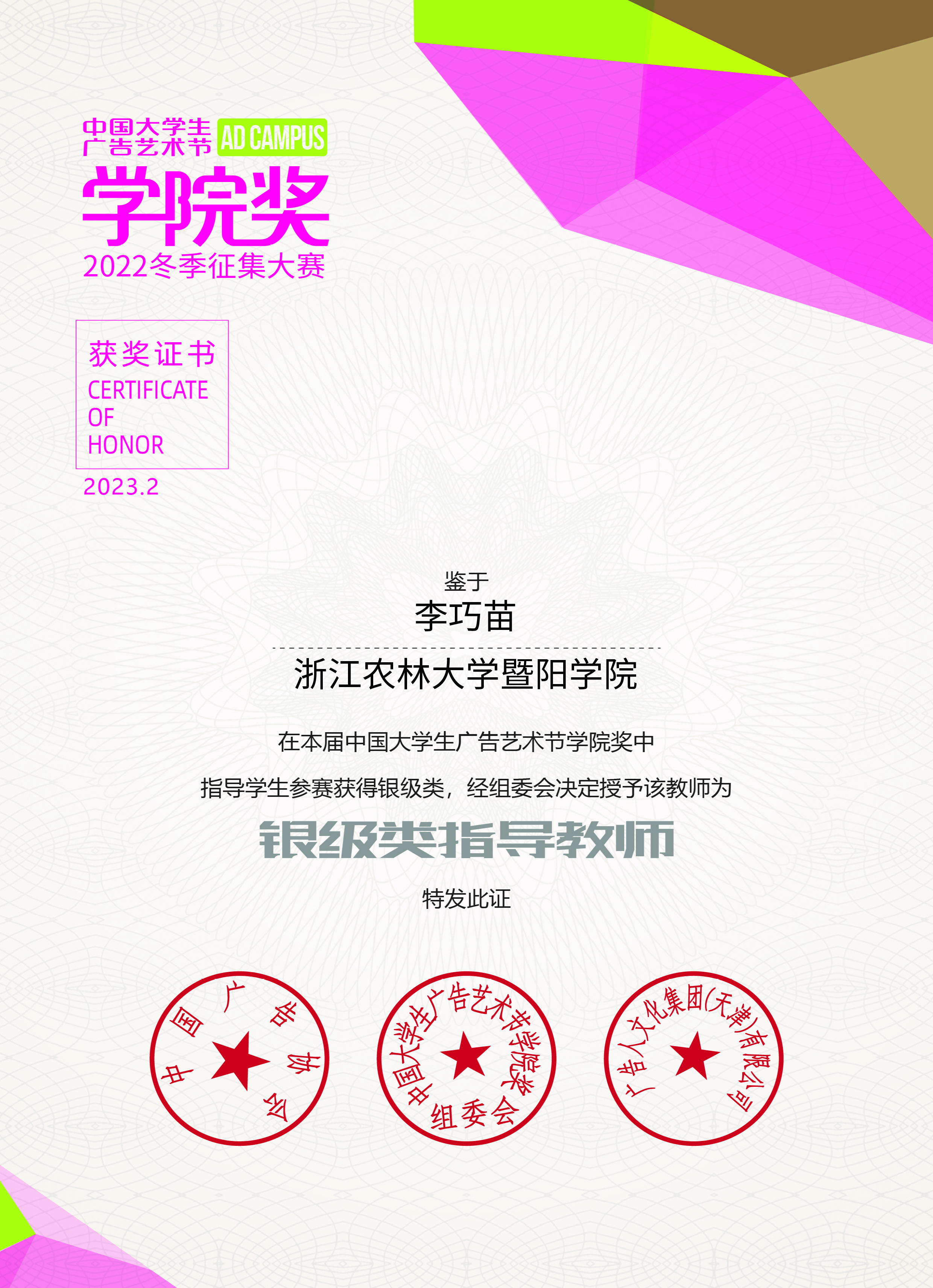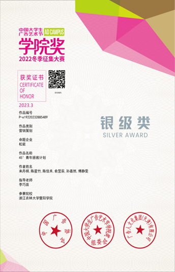 经过激烈角逐,我院广告学专业学生在本次大赛中获得国家级银奖1项,优秀奖3项,入围奖4项。其中由2021级广告学专业学生来丹棋、陈星竹、陈佳禾、俞昱辰、孙嘉然、傅静雯共同创作,教师李巧苗指导的作品《45°青年拯救计划》荣获“松能”营销策划类命题全国银奖。同时,李巧苗荣获“银级类杰出指导教师”称号。