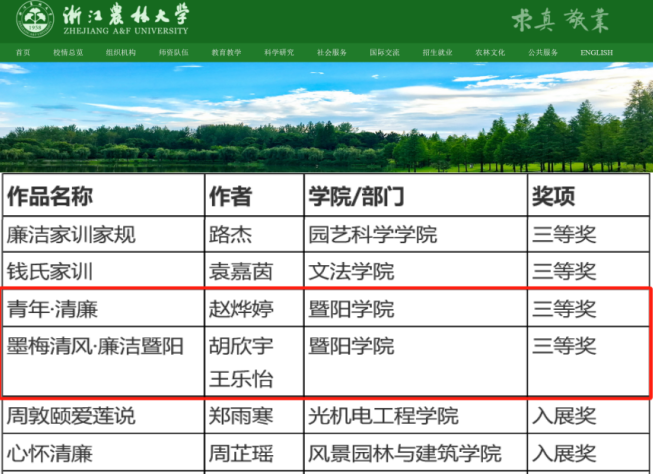 近日,学校党委宣传部、纪检监察室公布了学校“清风化人 廉洁润心”清廉文化作品大赛评选结果,我院报送的视频类作品《青年·清廉》和广告类作品《墨梅清风 廉洁暨阳》均获三等奖。