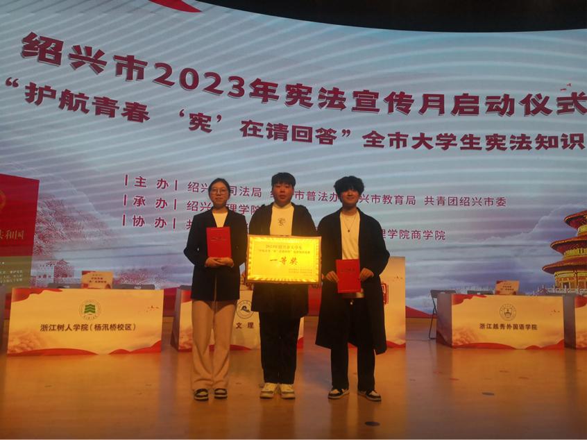 12月3日,由绍兴市普法办、司法局、教育局、共青团绍兴市委主办,绍兴文理学院承办的“护航青春,‘宪’在请回答”全市大学生宪法知识竞赛决赛在绍兴文理学院风则江大讲堂举行。人文学院法学211班王宏昌、方瀛娅,法学231班杨浩文三位同学组成的团队代表2138acom太阳集团并荣获一等奖。