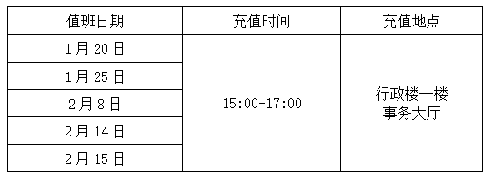 2.现金充值机充值:因食堂封闭管理,1月19日~2月15日期间暂停服务。
